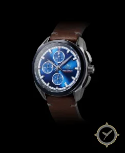 Eine Chronograph-Uhr mit einem markanten 48.5mm Auftritt am Handgelenk, gefertigt aus Edelstahl mit einem Zifferblatt in blau und einer besonderen "sunburst radial finish"-Oberfläche.