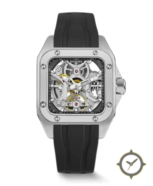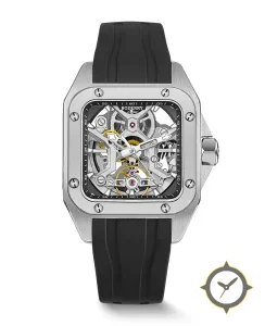 Eine Skelett-Uhr mit einem markanten 48mm Auftritt am Handgelenk, gefertigt aus Edelstahl mit einem Zifferblatt in silber und einer besonderen "open-worked"-Oberfläche.