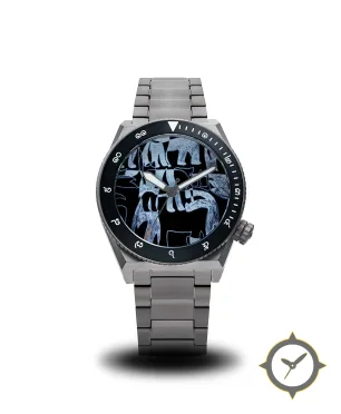 Eine Taucheruhr-Uhr mit einem 35.5mm Gehäuse im Vintage-Stil gefertigt aus Titan mit einem Zifferblatt in schwarz und einer besonderen "matte with printed texture"-Oberfläche.