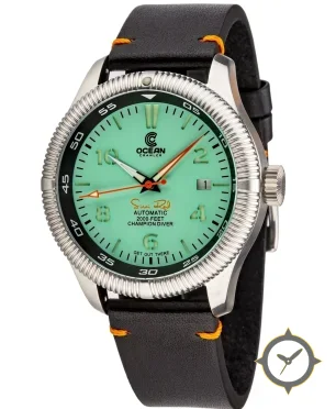 Eine Taucheruhr-Uhr mit einem 33.5mm Gehäuse im Vintage-Stil gefertigt aus Edelstahl mit einem Zifferblatt in türkis und einer besonderen "matte lacquer"-Oberfläche.