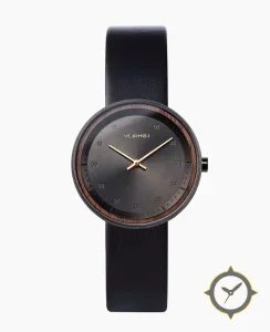 Eine Minimalistisch-Uhr mit einem 29.5mm Gehäuse im Vintage-Stil gefertigt aus Edelstahl mit einem Zifferblatt in schwarz und einer besonderen "sunburst brushed"-Oberfläche.