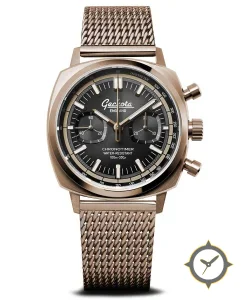 Eine Chronograph-Uhr mit einem markanten 46mm Auftritt am Handgelenk, gefertigt aus Edelstahl mit einem Zifferblatt in schwarz und einer besonderen "sunburst/gradient"-Oberfläche.