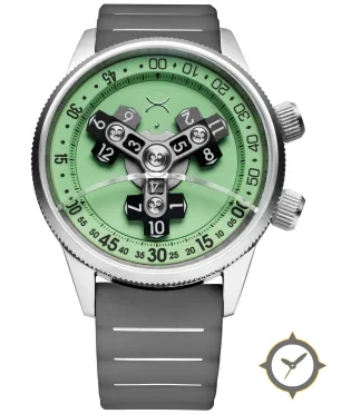 Eine Sport-Uhr mit einem markanten 45mm Auftritt am Handgelenk, gefertigt aus Edelstahl mit einem Zifferblatt in grün und einer besonderen "matte"-Oberfläche.