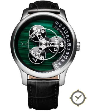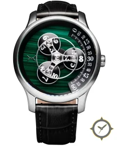 Eine Skelett-Uhr mit einem markanten 49mm Auftritt am Handgelenk, gefertigt aus Edelstahl mit einem Zifferblatt in grün und einer besonderen "malachite"-Oberfläche.