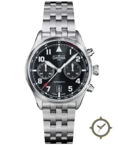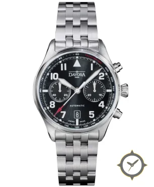 Eine Pilot-Uhr mit einem markanten 43mm Auftritt am Handgelenk, gefertigt aus Edelstahl mit einem Zifferblatt in schwarz und einer besonderen "sunburst / brushed finish"-Oberfläche.