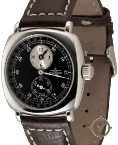 Eine Vintage-Uhr gefertigt aus Edelstahl mit einem Zifferblatt in schwarz und einer besonderen "smooth lacquer"-Oberfläche.