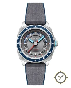 Eine Sport-Uhr mit einem markanten 49mm Auftritt am Handgelenk, gefertigt aus Edelstahl mit einem Zifferblatt in grau und einer besonderen "sunburst"-Oberfläche.