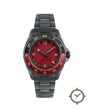Eine Vintage-Uhr mit einem 37mm Gehäuse im Vintage-Stil gefertigt aus Edelstahl mit einem Zifferblatt in rot und einer besonderen "grained/pebbled texture"-Oberfläche.