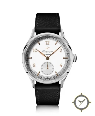 Eine Dress-Uhr mit einem vielseitigen 40.5mm Gehäuse, das an fast jedes Handgelenk passt, gefertigt aus Edelstahl mit einem Zifferblatt in weiß und einer besonderen "smooth lacquer"-Oberfläche.