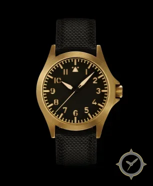 Eine Pilot-Uhr mit einem markanten 48mm Auftritt am Handgelenk, gefertigt aus Bronze mit einem Zifferblatt in schwarz und einer besonderen "matte"-Oberfläche.