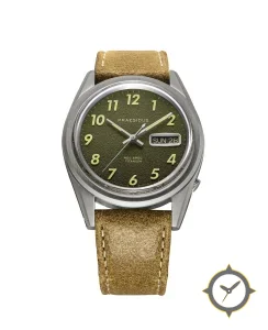 Eine Field-Uhr mit einem 32.5mm Gehäuse im Vintage-Stil gefertigt aus Titan mit einem Zifferblatt in grün und einer besonderen "textured/grain"-Oberfläche.