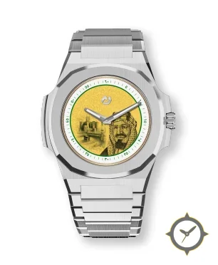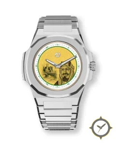 Eine Luxus-Uhr mit einem markanten 42mm Auftritt am Handgelenk, gefertigt aus Edelstahl mit einem Zifferblatt in gold und einer besonderen "engraved coin-like texture with fine arabesque guilloché"-Oberfläche.