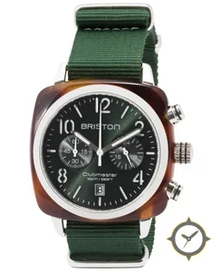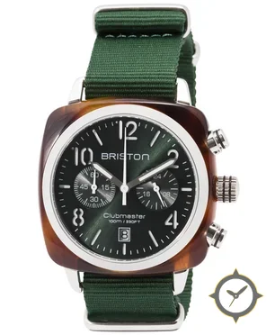 Eine Chronograph-Uhr mit einem markanten 46.5mm Auftritt am Handgelenk, gefertigt aus Harz mit einem Zifferblatt in grün und einer besonderen "sunburst"-Oberfläche.