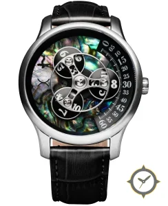 Eine Skelett-Uhr mit einem vielseitigen 40.5mm Gehäuse, das an fast jedes Handgelenk passt, gefertigt aus Edelstahl mit einem Zifferblatt in türkis und einer besonderen "abalone / mother-of-pearl iridescent"-Oberfläche.