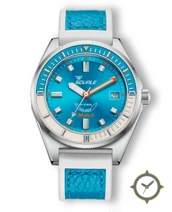 Eine Taucheruhr-Uhr mit einem 34mm Gehäuse im Vintage-Stil gefertigt aus Edelstahl mit einem Zifferblatt in türkis und einer besonderen "sunburst"-Oberfläche.