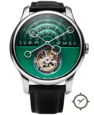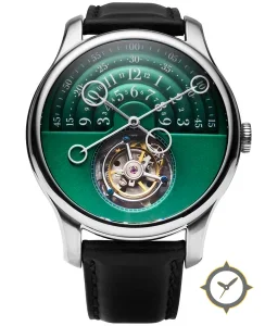 Eine Dress-Uhr mit einem markanten 53.5mm Auftritt am Handgelenk, gefertigt aus Gold mit einem Zifferblatt in weiß und einer besonderen "brushed metallic upper section with matte lower section"-Oberfläche.