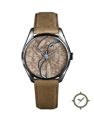 Eine Dress-Uhr mit einem markanten 46.5mm Auftritt am Handgelenk, gefertigt aus Edelstahl mit einem Zifferblatt in braun und einer besonderen "engraved relief / textured (cartographic)"-Oberfläche.
