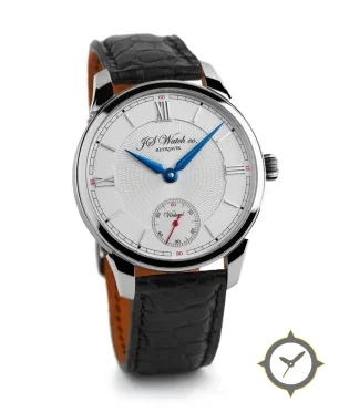 Eine Dress-Uhr mit einem 35mm Gehäuse im Vintage-Stil gefertigt aus Edelstahl mit einem Zifferblatt in weiß und einer besonderen "guilloché/engine-turned center with smooth outer chapter ring"-Oberfläche.
