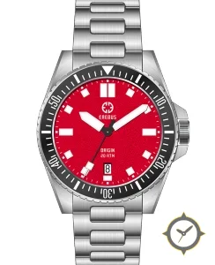 Eine Taucheruhr-Uhr mit einem 35.5mm Gehäuse im Vintage-Stil gefertigt aus Edelstahl mit einem Zifferblatt in rot und einer besonderen "grained"-Oberfläche.