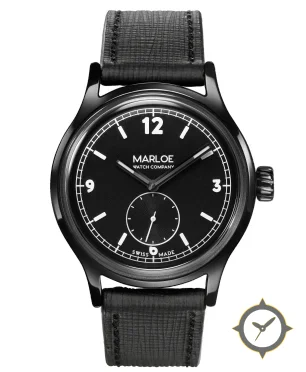 Eine Field-Uhr mit einem 33mm Gehäuse im Vintage-Stil gefertigt aus Edelstahl mit einem Zifferblatt in schwarz und einer besonderen "matte/grained"-Oberfläche.