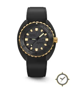 Eine Taucheruhr-Uhr mit einem markanten 45mm Auftritt am Handgelenk, gefertigt aus Edelstahl mit einem Zifferblatt in schwarz und einer besonderen "granular (sandblasted)"-Oberfläche.
