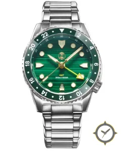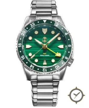Eine GMT-Uhr mit einem markanten 45mm Auftritt am Handgelenk, gefertigt aus Edelstahl mit einem Zifferblatt in grün und einer besonderen "malachite/striped sunburst texture"-Oberfläche und einer echten GMT-Funktion, mit der du eine zweite Zeitzone verfolgen kannst.