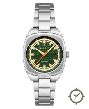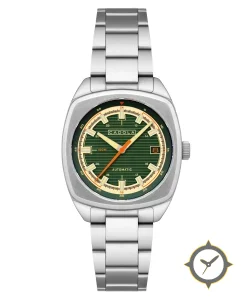 Eine Vintage-Uhr mit einem markanten 46mm Auftritt am Handgelenk, gefertigt aus Edelstahl mit einem Zifferblatt in grün und einer besonderen "horizontal lined (striped)"-Oberfläche.