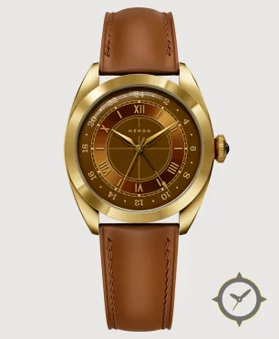 Eine GMT-Uhr mit einem vielseitigen 40mm Gehäuse, das an fast jedes Handgelenk passt, gefertigt aus Gold mit einem Zifferblatt in braun und einer besonderen "sunburst"-Oberfläche und einer echten GMT-Funktion, mit der du eine zweite Zeitzone verfolgen kannst.