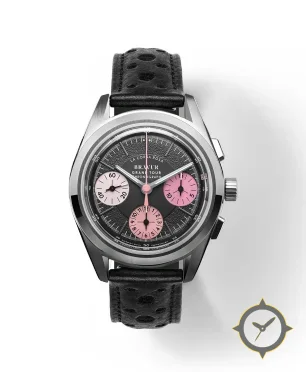 Eine Chronograph-Uhr mit einem 37.5mm Gehäuse im Vintage-Stil gefertigt aus Edelstahl mit einem Zifferblatt in schwarz und einer besonderen "textured/grained"-Oberfläche.