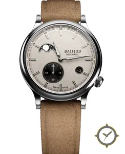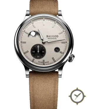Eine Dress-Uhr mit einem markanten 49mm Auftritt am Handgelenk, gefertigt aus Edelstahl mit einem Zifferblatt in weiß und einer besonderen "matte, lightly grained/sandblasted texture"-Oberfläche und einer wunderschönen Mondphasenanzeige.
