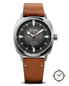 Eine Vintage-Uhr mit einem 36mm Gehäuse im Vintage-Stil gefertigt aus Edelstahl mit einem Zifferblatt in grau und einer besonderen "sunburst/gradient (fumé)"-Oberfläche.