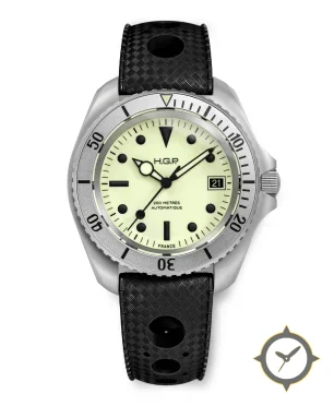 Eine Taucheruhr-Uhr mit einem 33.5mm Gehäuse im Vintage-Stil gefertigt aus Edelstahl mit einem Zifferblatt in grün und einer besonderen "super-luminova matte"-Oberfläche.
