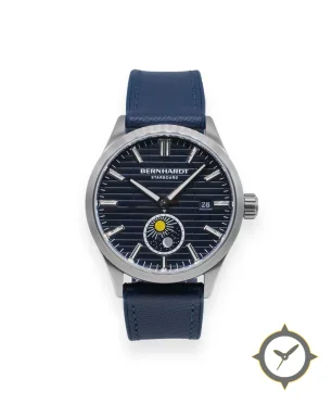 Eine Nautisch-Uhr mit einem markanten 45.5mm Auftritt am Handgelenk, gefertigt aus Edelstahl mit einem Zifferblatt in marineblau und einer besonderen "horizontal teak-line texture"-Oberfläche und einer wunderschönen Mondphasenanzeige.