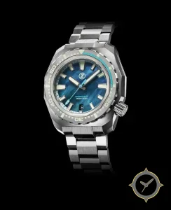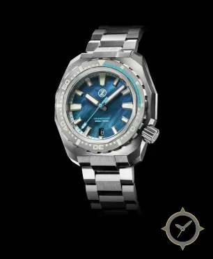 Eine Taucheruhr-Uhr mit einem 35.5mm Gehäuse im Vintage-Stil gefertigt aus Edelstahl mit einem Zifferblatt in blau und einer besonderen "mother-of-pearl (iridescent)"-Oberfläche.