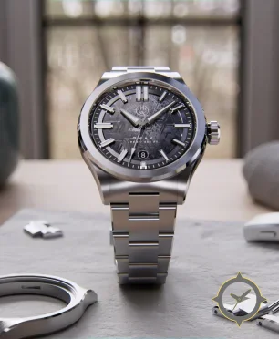 Eine Sport-Uhr mit einem markanten 42.5mm Auftritt am Handgelenk, gefertigt aus Edelstahl mit einem Zifferblatt in grau und einer besonderen "meteorite"-Oberfläche.