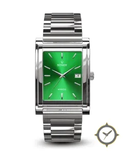 Eine Dress-Uhr mit einem 33mm Gehäuse im Vintage-Stil gefertigt aus Edelstahl mit einem Zifferblatt in grün und einer besonderen "sunburst gradient"-Oberfläche.