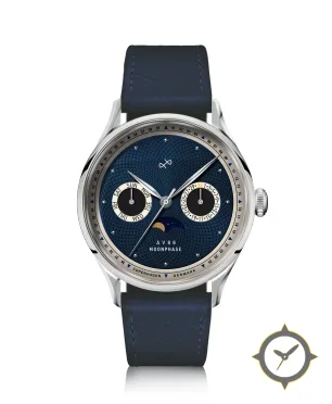 Eine Dress-Uhr mit einem markanten 41.5mm Auftritt am Handgelenk, gefertigt aus Edelstahl mit einem Zifferblatt in blau und einer besonderen "guilloche (radial textured)"-Oberfläche und einer wunderschönen Mondphasenanzeige.