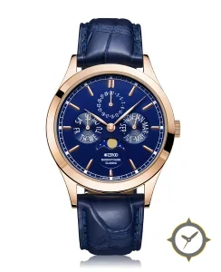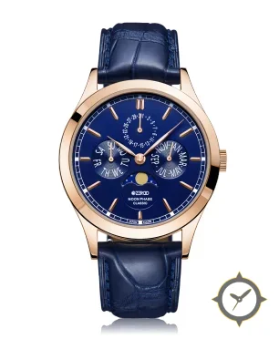 Eine Dress-Uhr mit einem markanten 44mm Auftritt am Handgelenk, gefertigt aus Gold mit einem Zifferblatt in blau und einer besonderen "sunburst"-Oberfläche und einer wunderschönen Mondphasenanzeige.