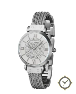 Eine Dress-Uhr mit einem 35mm Gehäuse im Vintage-Stil gefertigt aus Edelstahl mit einem Zifferblatt in weiß und einer besonderen "pavé crystal center with smooth outer chapter ring"-Oberfläche.