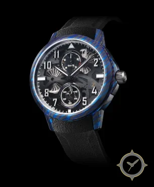 Eine Skelett-Uhr mit einem markanten 42.5mm Auftritt am Handgelenk, gefertigt aus Carbon mit einem Zifferblatt in schwarz und einer besonderen "open-worked / skeletonized"-Oberfläche und einer praktischen Gangreserveanzeige.