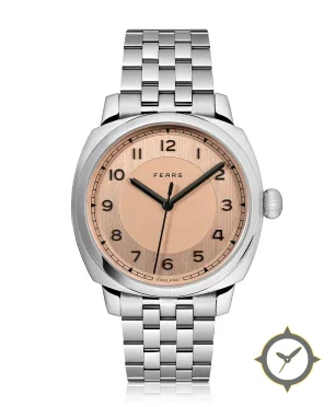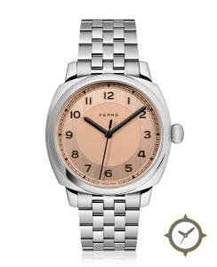 Eine Dress-Uhr mit einem markanten 47mm Auftritt am Handgelenk, gefertigt aus Edelstahl mit einem Zifferblatt in gold und einer besonderen "vertical brushed outer ring with smooth inner sector (two-tone/sector dial)"-Oberfläche.