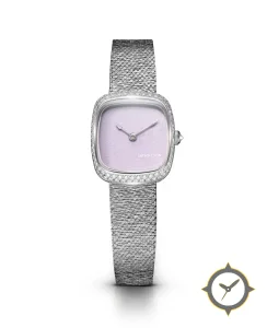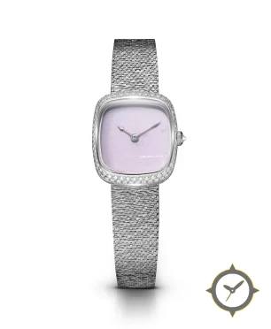 Eine Dress-Uhr mit einem 28.5mm Gehäuse im Vintage-Stil gefertigt aus Edelstahl mit einem Zifferblatt in lila und einer besonderen "matte, slightly paper-like textured finish"-Oberfläche.