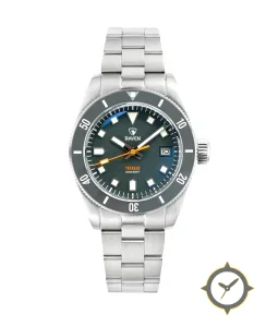 Eine Taucheruhr-Uhr mit einem markanten 42.5mm Auftritt am Handgelenk, gefertigt aus Edelstahl mit einem Zifferblatt in grün und einer besonderen "sunburst"-Oberfläche.