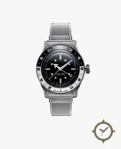 Eine GMT-Uhr mit einem 34mm Gehäuse im Vintage-Stil gefertigt aus Edelstahl mit einem Zifferblatt in schwarz und einer besonderen "glossy"-Oberfläche und einer echten GMT-Funktion, mit der du eine zweite Zeitzone verfolgen kannst.