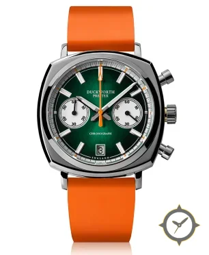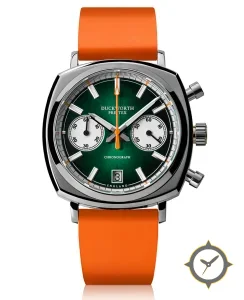 Eine Chronograph-Uhr mit einem vielseitigen 39mm Gehäuse, das an fast jedes Handgelenk passt, gefertigt aus Edelstahl mit einem Zifferblatt in grün und einer besonderen "sunburst"-Oberfläche.