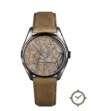 Eine Minimalistisch-Uhr mit einem vielseitigen 41mm Gehäuse, das an fast jedes Handgelenk passt, gefertigt aus Edelstahl mit einem Zifferblatt in braun und einer besonderen "engraved map relief (textured streets and topography)"-Oberfläche.