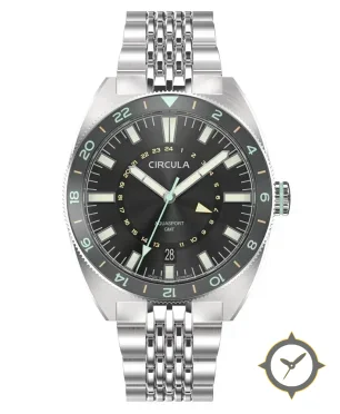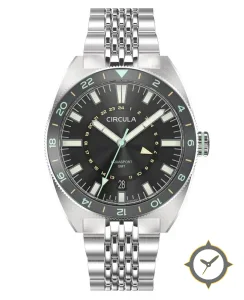 Eine GMT-Uhr mit einem markanten 43.5mm Auftritt am Handgelenk, gefertigt aus Edelstahl mit einem Zifferblatt in schwarz und einer besonderen "sunburst"-Oberfläche und einer echten GMT-Funktion, mit der du eine zweite Zeitzone verfolgen kannst.
