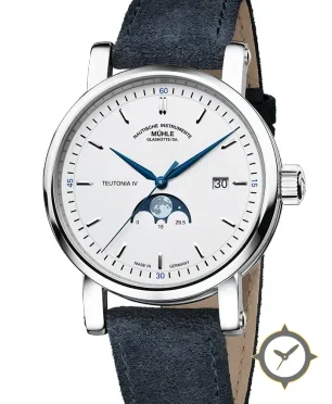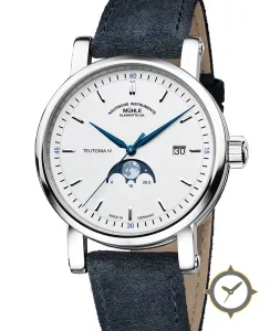 Eine Dress-Uhr mit einem vielseitigen 39.5mm Gehäuse, das an fast jedes Handgelenk passt, gefertigt aus Edelstahl mit einem Zifferblatt in weiß und einer besonderen "smooth"-Oberfläche und einer wunderschönen Mondphasenanzeige.