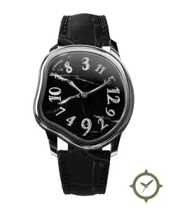 Eine Dress-Uhr mit einem 8mm Gehäuse im Vintage-Stil gefertigt aus Edelstahl mit einem Zifferblatt in schwarz und einer besonderen "marble (black with white veining)"-Oberfläche.