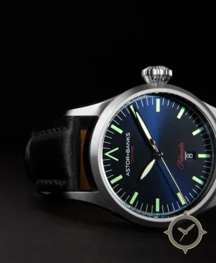Eine Pilot-Uhr mit einem vielseitigen 38.5mm Gehäuse, das an fast jedes Handgelenk passt, gefertigt aus Edelstahl mit einem Zifferblatt in blau und einer besonderen "sunburst"-Oberfläche.
